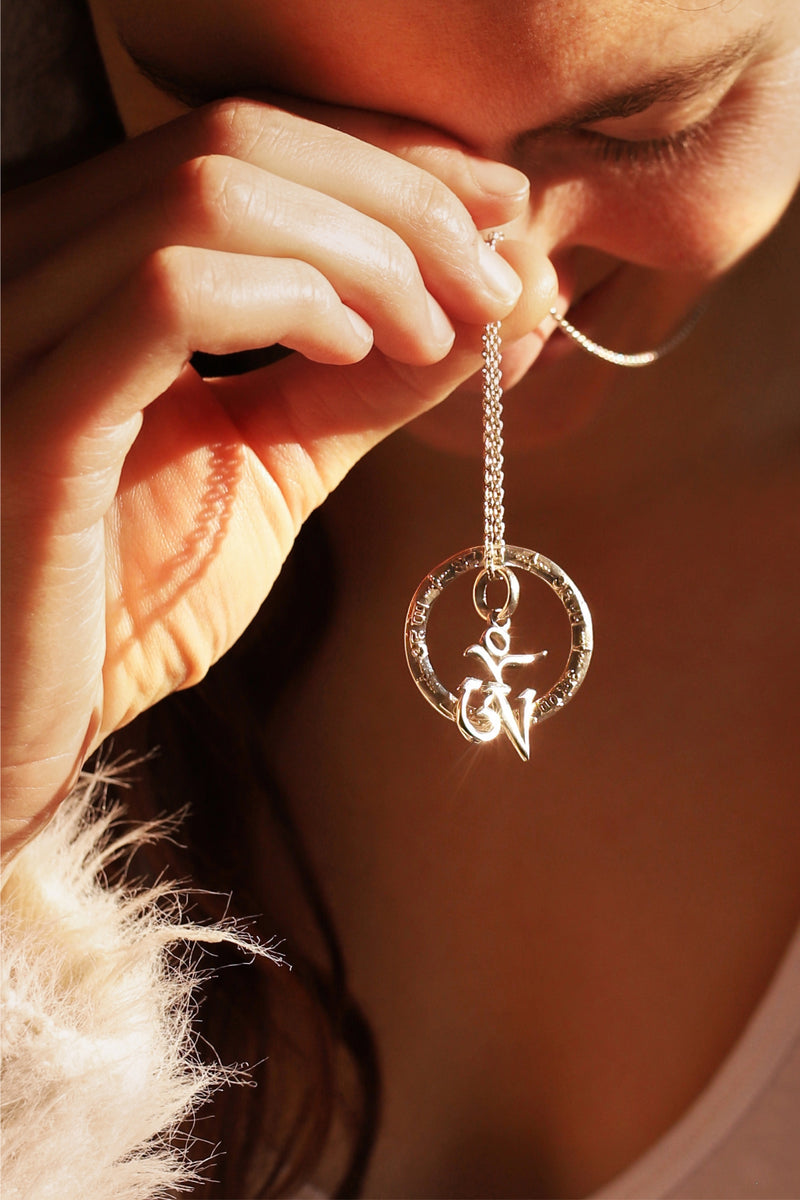 Bei dem Design unserer Mantra Anhänger haben wir uns von der Natur der Mantras, ihren göttlichen Klängen und ihren unendlichen Schwingungen inspirieren lassen. Daraus entwickelten wir für unser Design als Basisform den Kreis. Er repräsentiert die Unendlichkeit, den Kosmos, der aus Schwingungen besteht und der Kreis symbolisiert auch den Geist. Praktisch fördert er die Konzentration und hilft uns, unsere Gedanken zu fokussieren. Die kreisrunde Form und die drehende Bewegung des Anhängers, spiegelt auch das Prinzip der tibetischen Gebetsmühle wider: Jede Umdrehung entspricht einer Rezitation des Mantras.