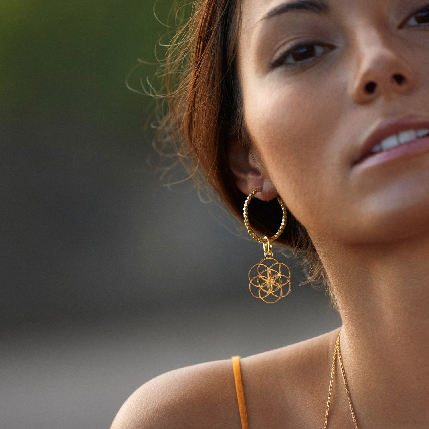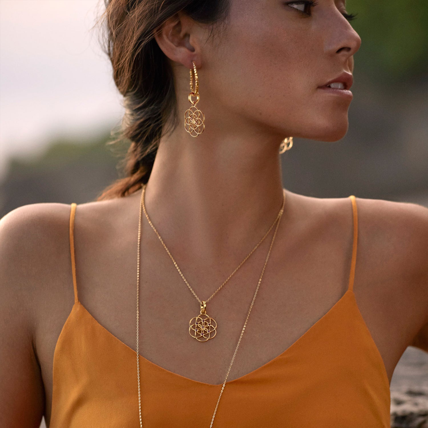 Die Yogalehrerin Steffi trägt die vergoldeten Samen-des-Lebens-Kreolen mit Beads zu euiner Samen-des-Lbens-Kette mit Rubinen