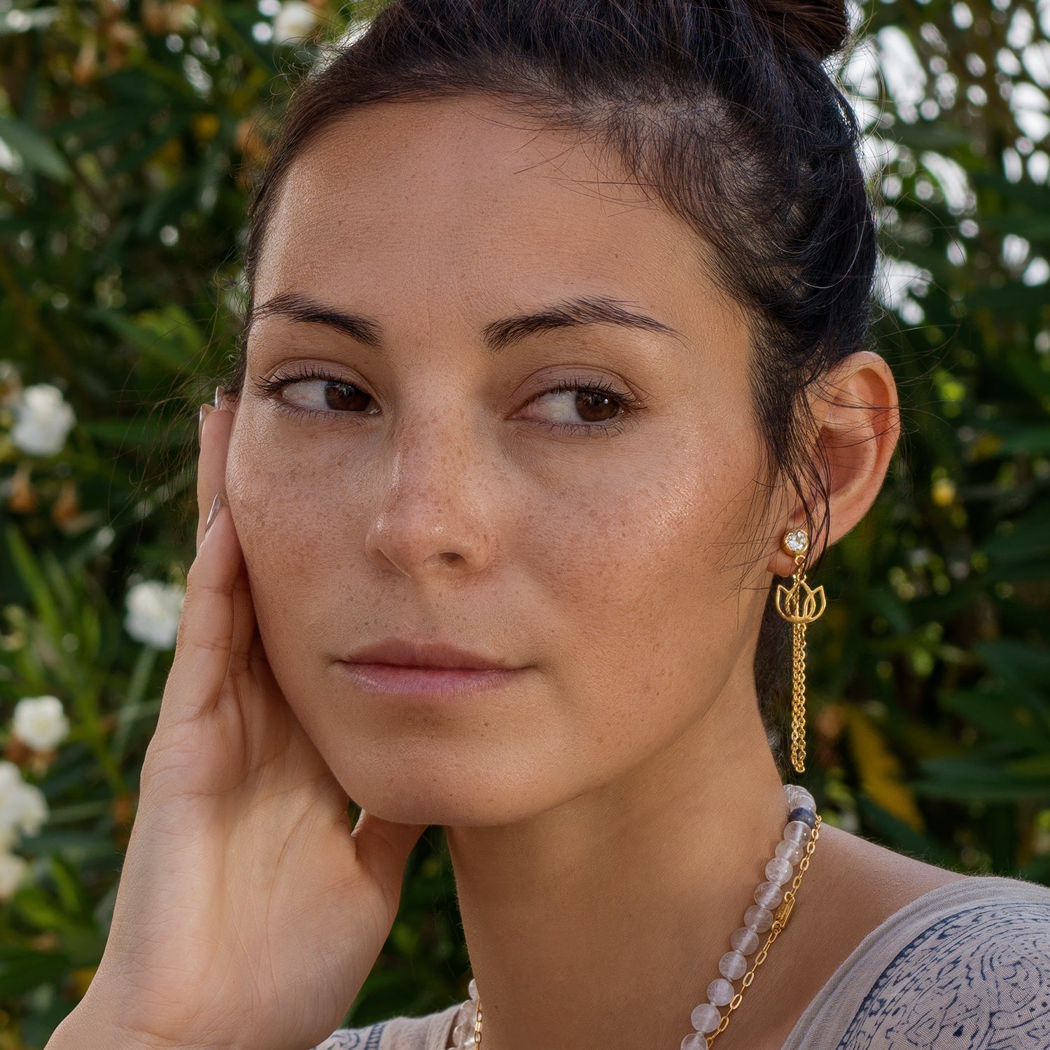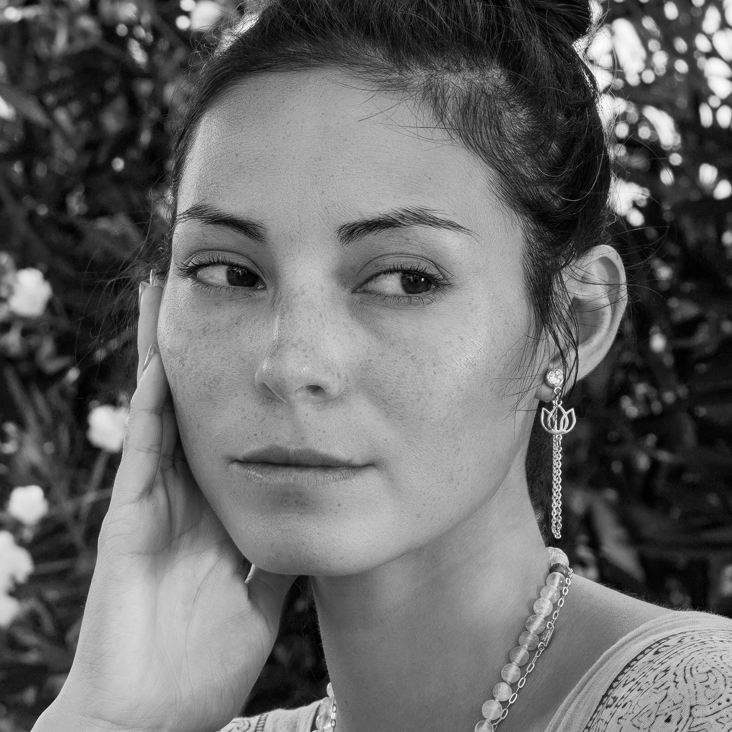 Die Balinesische Yoga Lehrerin Steffi trägt Lotusschmuck: Symbol für Strahlende Reinheit und Erleuchtung