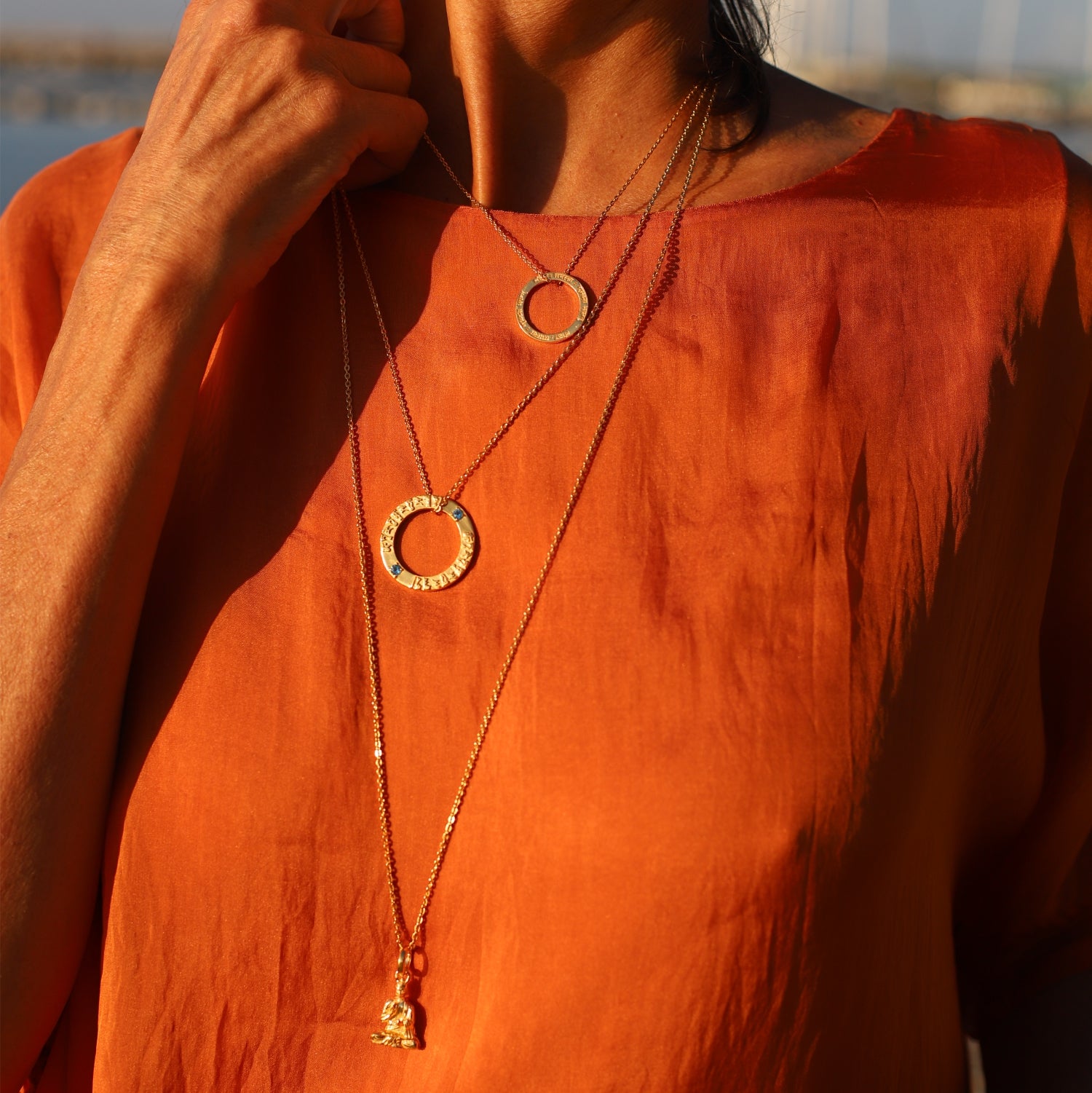 Cora trägt einen Lokah Samastah Mantra Anhänger vergoldet von ETERNAL BLISS - Spiritueller Schmuck
