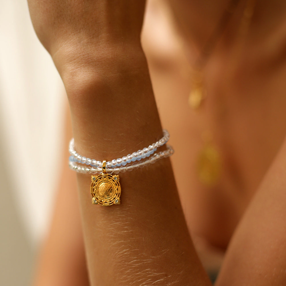 Das Sri Yantra oder Shree Yantra ist das am weitesten verbreitete aller Yantras und gilt als das mächtigste. Es besteht aus neun ineinander greifenden Dreiecken, vier nach oben zeigende, die das männliche Prinzip oder Shiva repräsentieren, und fünf nach unten zeigende, die das weibliche Prinzip oder Shakti darstellen. Das Zusammenspiel dieser beiden Prinzipien ergibt ein verbundenes Feld aus 43 kleineren Dreiecken. Sie sind von zwei stilisierten Lotusblüten umgeben, die erste mit acht und die zweite mit sechzehn Blütenblättern. In einigen Darstellungen wird diese Kreisform zusätzlich von einem quadratischen "Tempel" mit vier Portalen umschlossen, die die vier Himmelsrichtungen darstellen. Dieser Rahmen ist die Quelle der markanten Form einiger unserer Sri Yantra Meditationsschmuckstücke. Andere Sri Yantra Anhänger folgen der kreisförmigen Form, die durch die stilisierten Lotusblumenringe vorgegeben ist. In diesem Fall stellen wir die vier Portale zum Yantra mit atemberaubenden Aquamarinen oder Rubinen dar.