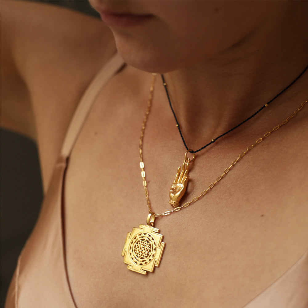 Ein Yantra ist ein traditionelles Diagramm, das einen Aspekt des Göttlichen als geometrische Figur darstellt. Yantras sind sehr alte Werkzeuge der Verehrung und Meditation, dessen Geschichte in Indien bis mindestens 10.000 v. Chr. zurückreicht. Im Laufe der Jahrtausende hat sich eine Vielzahl von ausgefeilten Yantra Diagrammen als Symbole für bestimmte Gottheiten und zur Erreichung verschiedener Ziele entwickelt. Sie werden als rituellen Gegenständen in Tempeln verwendet und oft auch als Halskette getragen. Die Geschichte und Bedeutung von Yantras - insbesondere die traditionelle Rolle von Yantra Anhängern und Amulette als sowohl schöne Verzierungen als auch kraftvolle Werkzeuge für die Meditation - hat uns dazu inspiriert, unseren eigenen Yantra Schmuck zu kreieren. Dieses spirituelle Mysterium zu verinnerlichen ist der Weg und das Ziel in der Meditation vor und mit dem Sri Yantra. Heute gilt es in der heiligen Geometrie als eines der reinsten und kraftvolles Symbole.