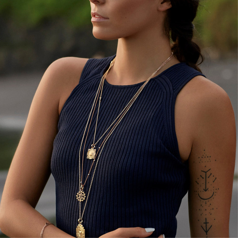 Um den hochgradigen Wert von Yantra Symbolen widerzuspiegeln, wird all unser Yantra Meditationsschmuck sorgfältig aus den feinsten Edelmetallen gefertigt. Wir verwenden 925er Sterling Silber, und vergolden es in 24 Karat Gold oder Rosé Gold. Bei einigen unserer Yantra Anhänger betonen wir außerdem Schlüsselpunkte im Design mit echten Aquamarinen oder Rubinen, um die Energie des Yantras zu erhöhen und zu verstärken. In jedem Fall machen das angenehme Gewicht und die geformten Konturen unseres Mediationsschmucks unsere Anhänger zu einem Vergnügen beim Tragen und Anfühlen.