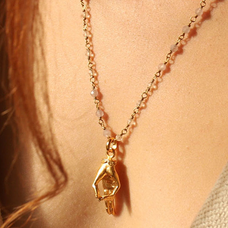 Es entstanden auch Symbole, die komplexe Ideen als abstrakte Zeichen ausdrückten oder Gottheiten und höhere Energien abbildeten. Schmuck mit diesen Aspekten konnte magische Kraft oder Schutz verleihen, die Hingabe an eine bestimmte spirituelle Lehre signalisieren oder ein religiöses oder philosophisches Bekenntnis im Bewusstsein des Trägers bewirken. Spirituelle Symbole repräsentieren unsere Verbindung zu anderen Existenzebenen, und in der From eines Schmuckstückes, können wir sie eng in unser tägliches Leben einbeziehen. Es ist kein Zufall, dass magischer Schmuck - in Form von Halsketten, Anhängern und Amuletten - in den traditionellen Erzählungen, Sagen und Mythen von Kulturen auf der ganzen Welt vorkommt. Eine weitere faszinierende Kategorie von Symbolen mit einer uralten Geschichte sind Handgesten oder Mudras, die sich in verschiedenen Traditionen zu präzisen energetisierenden Bedeutungen entwickelt haben.